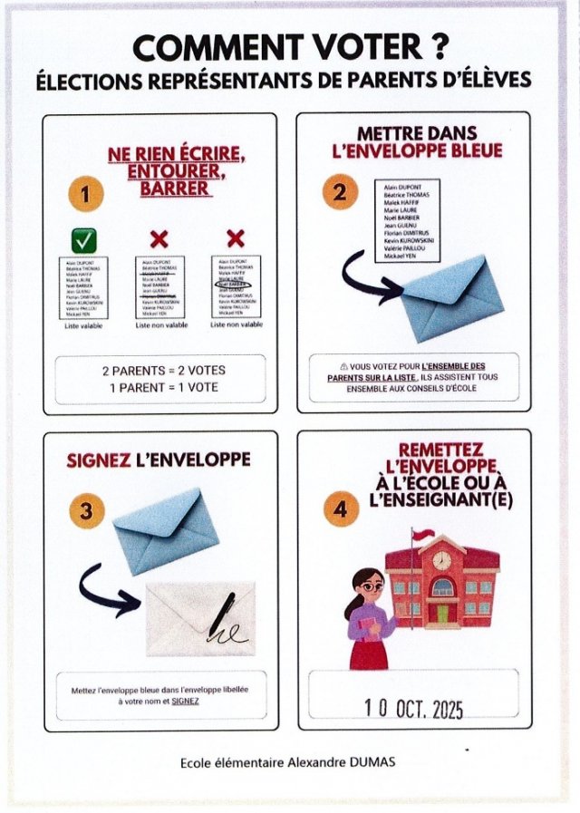 L’enveloppe remise par votre enfant contient tout le matériel nécessaire pour voter. Les 2 parents sont invités à voter.
