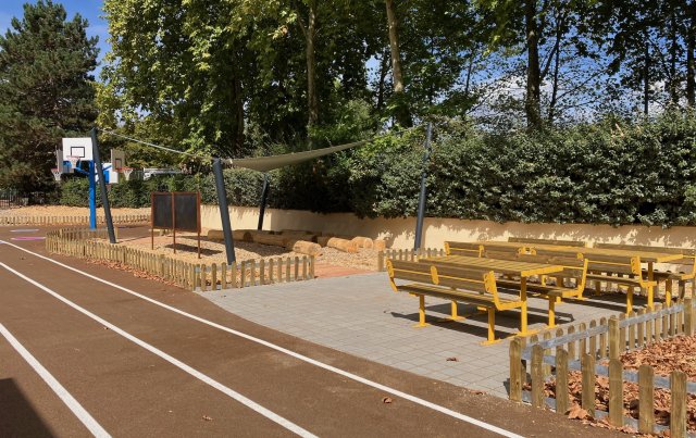 Le 1er septembre dernier, les élèves ont retrouvé le chemin de l’école et ont eu la chance de découvrir une toute nouvelle cour "oasis". Ils adorent l’espace classe dans lequel ils peuvent s’assoir à l’ombre, l’arbre à paniers de basket, ou encore le tout nouveau terrain de football/basketball.